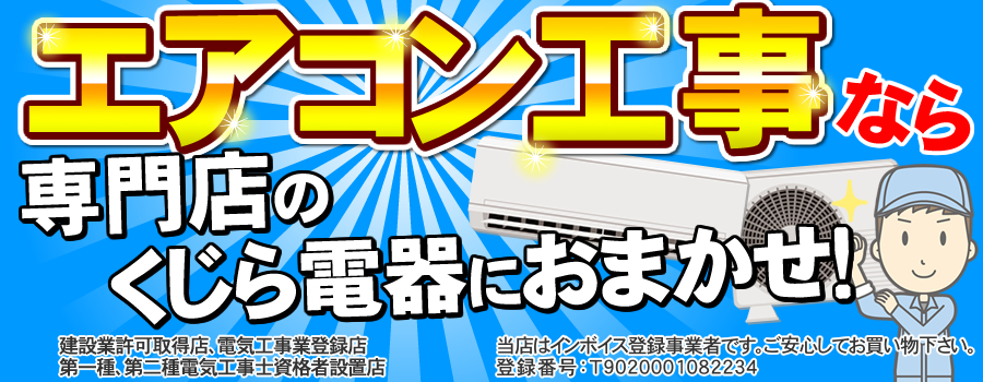 家庭用エアコンのことなら、エアコン取り付け専門店 くじら電器までお気軽にお問い合わせください。家庭用であれば、6畳用から26畳用まで、各社取り扱いあり。交換、取り付けのみ、新築、穴あけ、配管カバー取り付け、2段置き、壁掛け、天井吊り設置、取外し、引き取り、リサイクルまで、何でも対応します。
